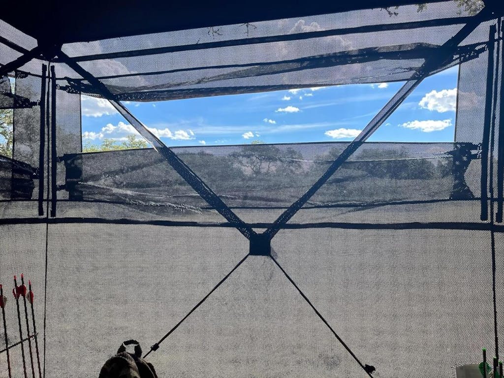 The hunting blind is equipped with three full panels of one-way see through material. This material delivers a 270-degree unobstructed wide view angle and allows hunters to see their surroundings.